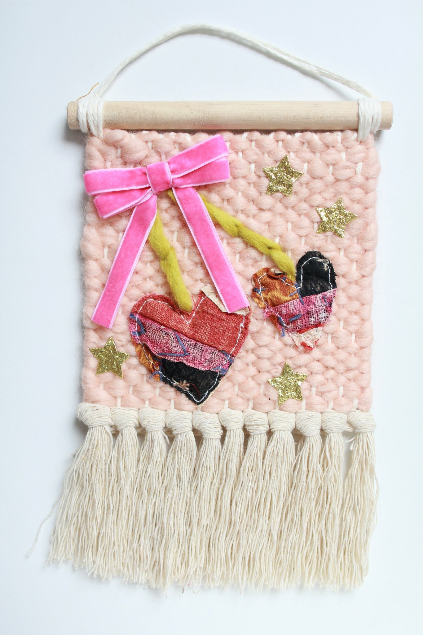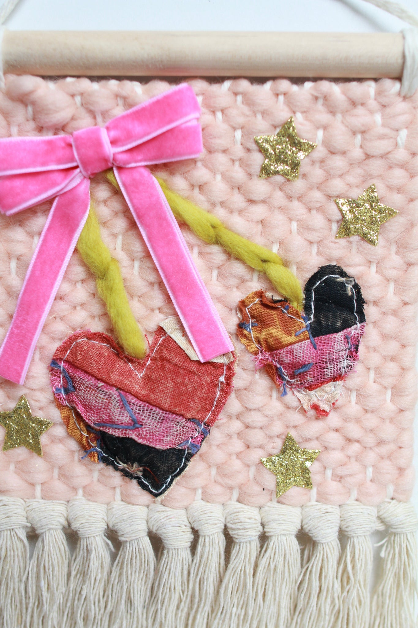 Cherry heart wall hanging using quilt scrapsApprox Measurements:Length below dowel 8 inches Weave at its widest: 5 inches